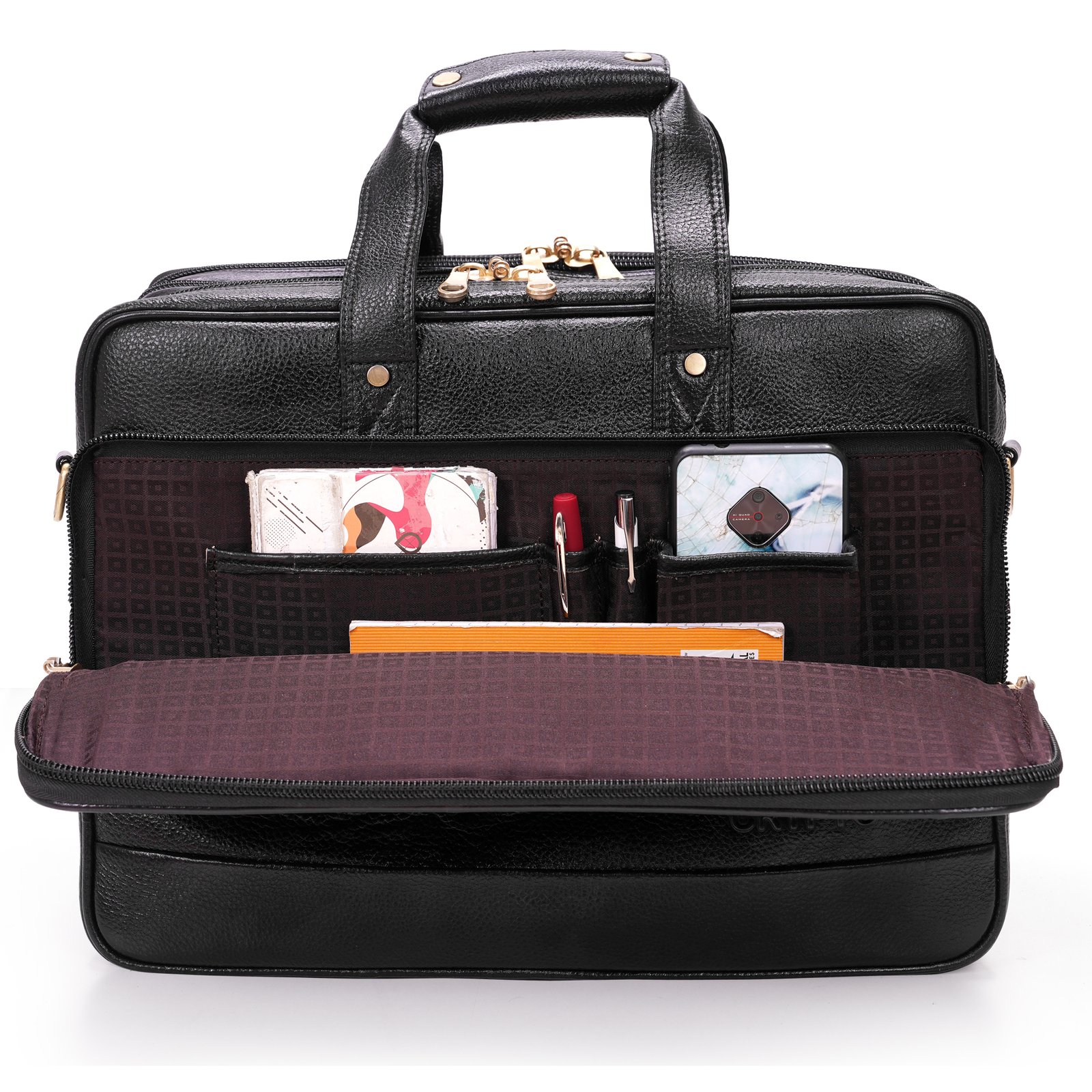 This slim leather bag is crafted from premium crocodile-embossed leather in a rich burgundy tone, combining style with functionality. Featuring multiple zippered compartments, gold-tone hardware, and a detachable shoulder strap, it is perfect for professionals seeking a sleek and organized carry solution. Ideal for daily commutes, business meetings, or travel. Key Features: Made from genuine leather 1 main zip compartment with padded laptop section (fits up to 15″) 5 additional zippered pockets for accessories 1 mobile/card/pen slot for easy access Trolley holder strap for travel convenience Removable and adjustable long shoulder strap Dimensions: Height – 28 cm, Length – 40 cm, Width – 6.5 cm Perfect for business professionals, students, and frequent travelers, this slim leather laptop bag offers a stylish and functional solution for carrying your laptop, documents, and daily essentials—whether you’re heading to the office, campus, or catching a flight. Disclaimer: Product color may slightly vary due to photographic lighting or