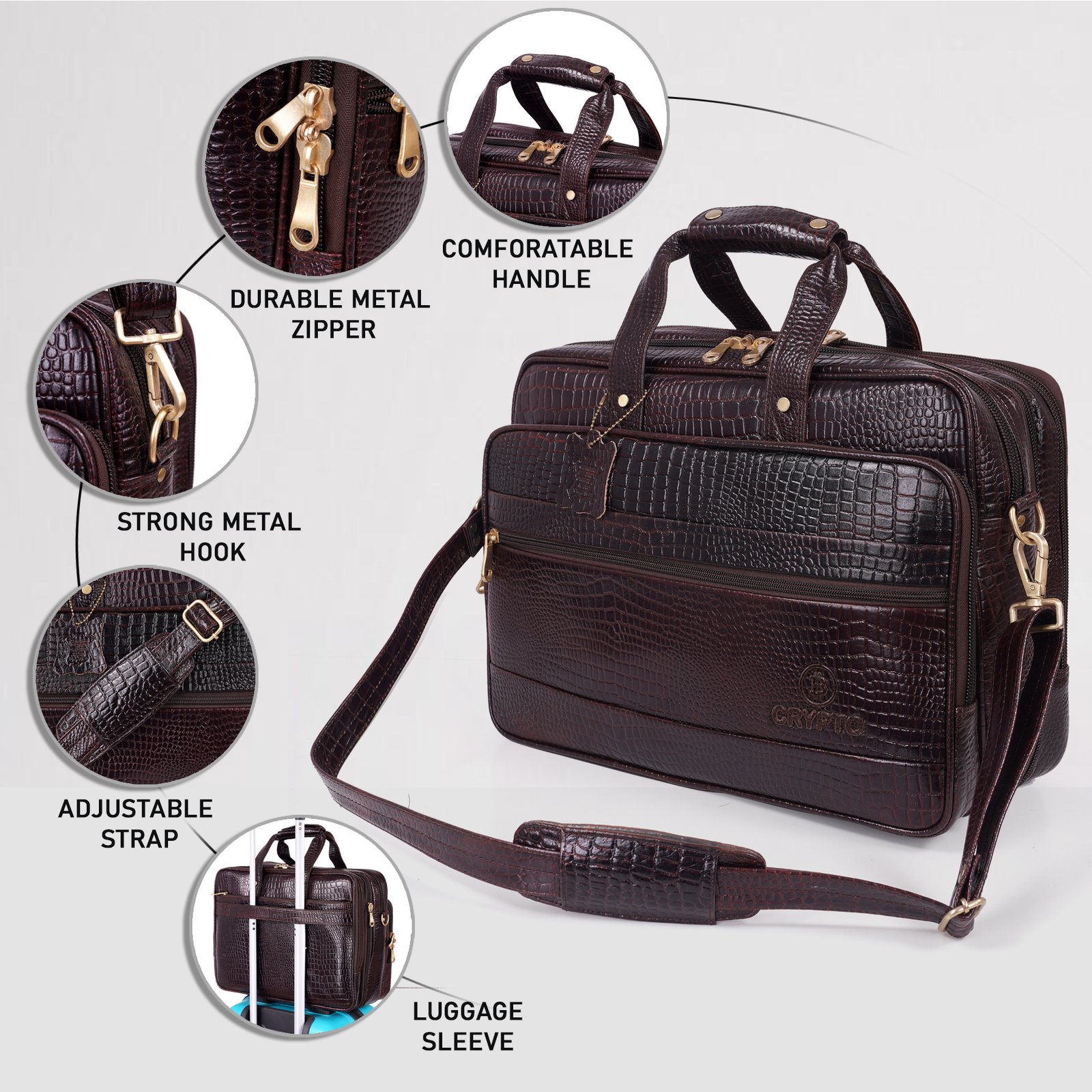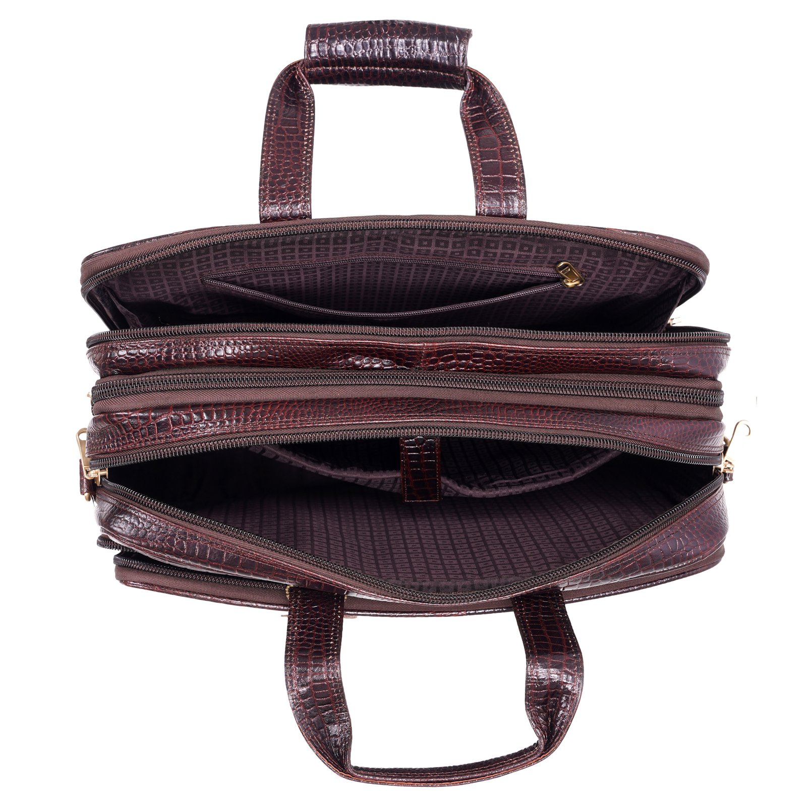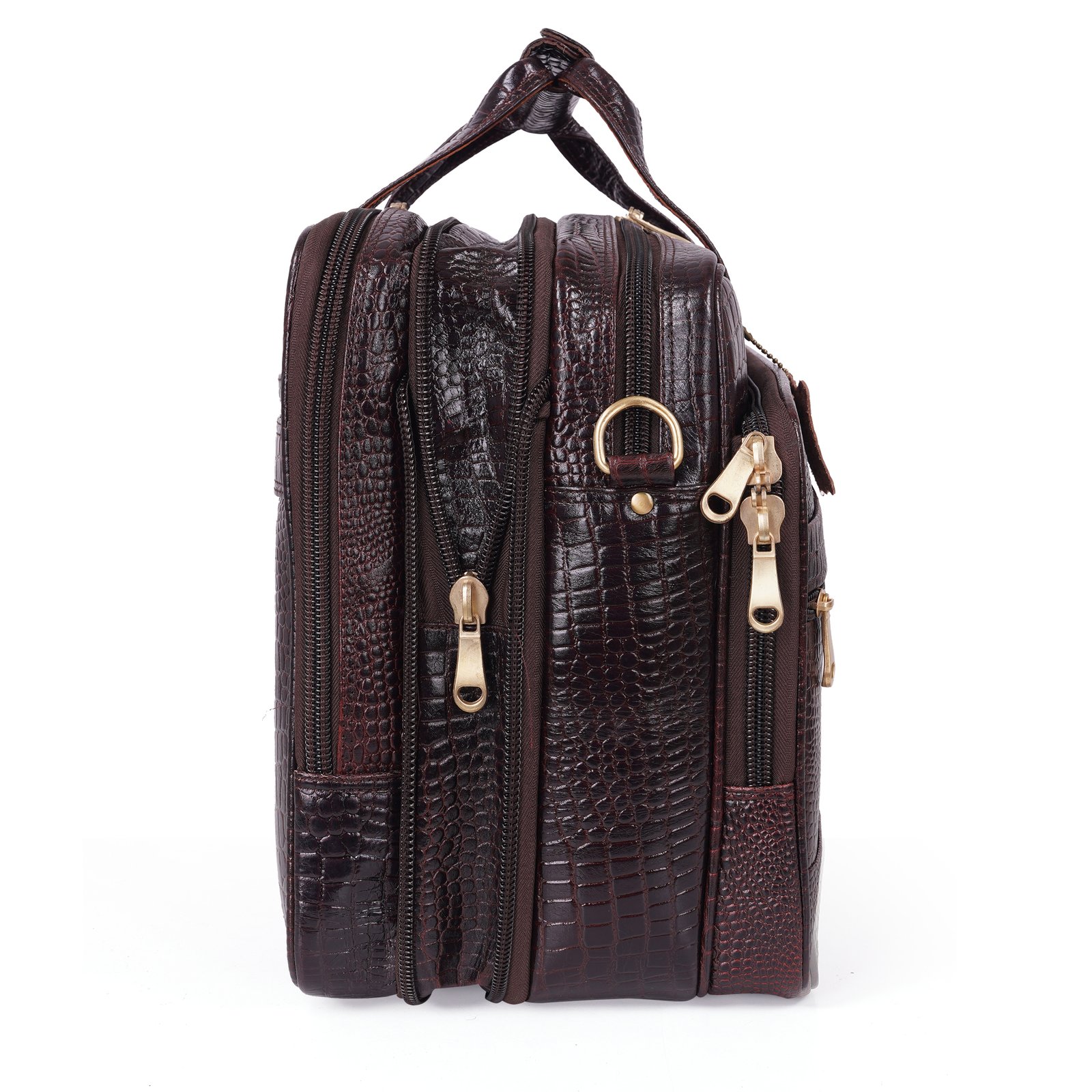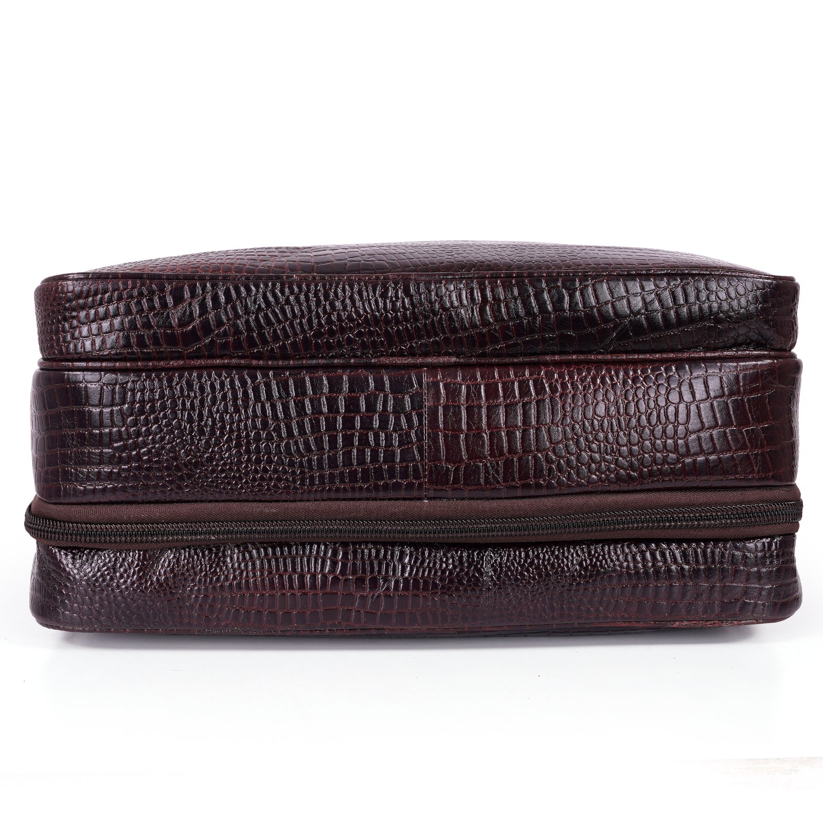 This slim leather bag is crafted from premium crocodile-embossed leather in a rich burgundy tone, combining style with functionality. Featuring multiple zippered compartments, gold-tone hardware, and a detachable shoulder strap, it is perfect for professionals seeking a sleek and organized carry solution. Ideal for daily commutes, business meetings, or travel.