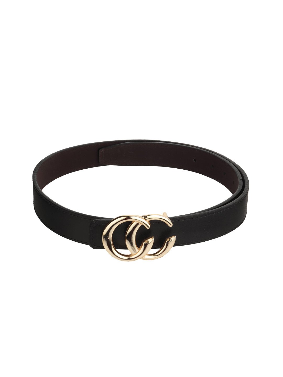 Black solid belt with gold-tone buckle. Secured with a sturdy push pin closure for ease and comfort. Reversible: No Stretchable: No Secured with a push pin Size & Fit Width: 3.25 cm Material & Care Synthetic Leather Wipe with a clean, dry cloth to remove dust