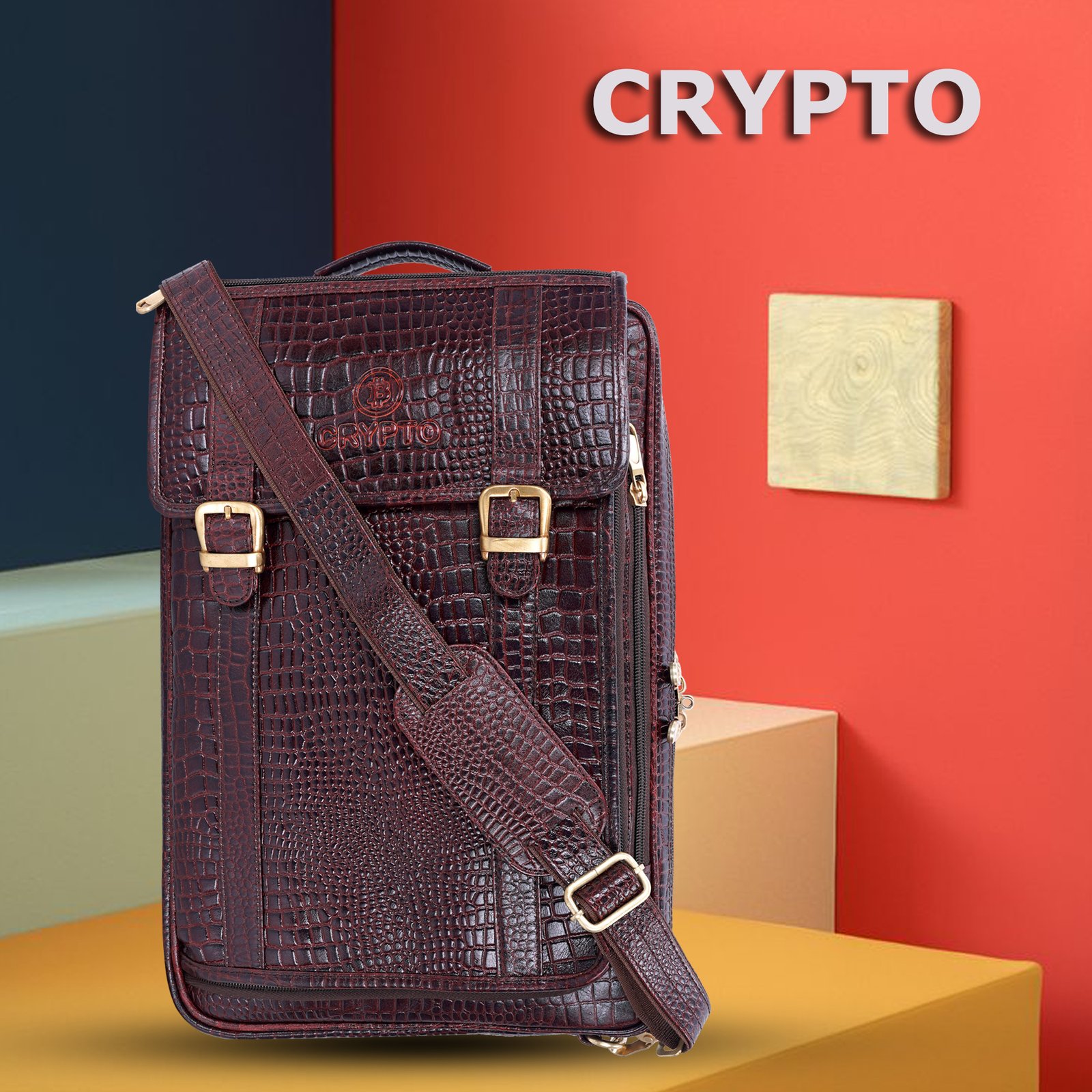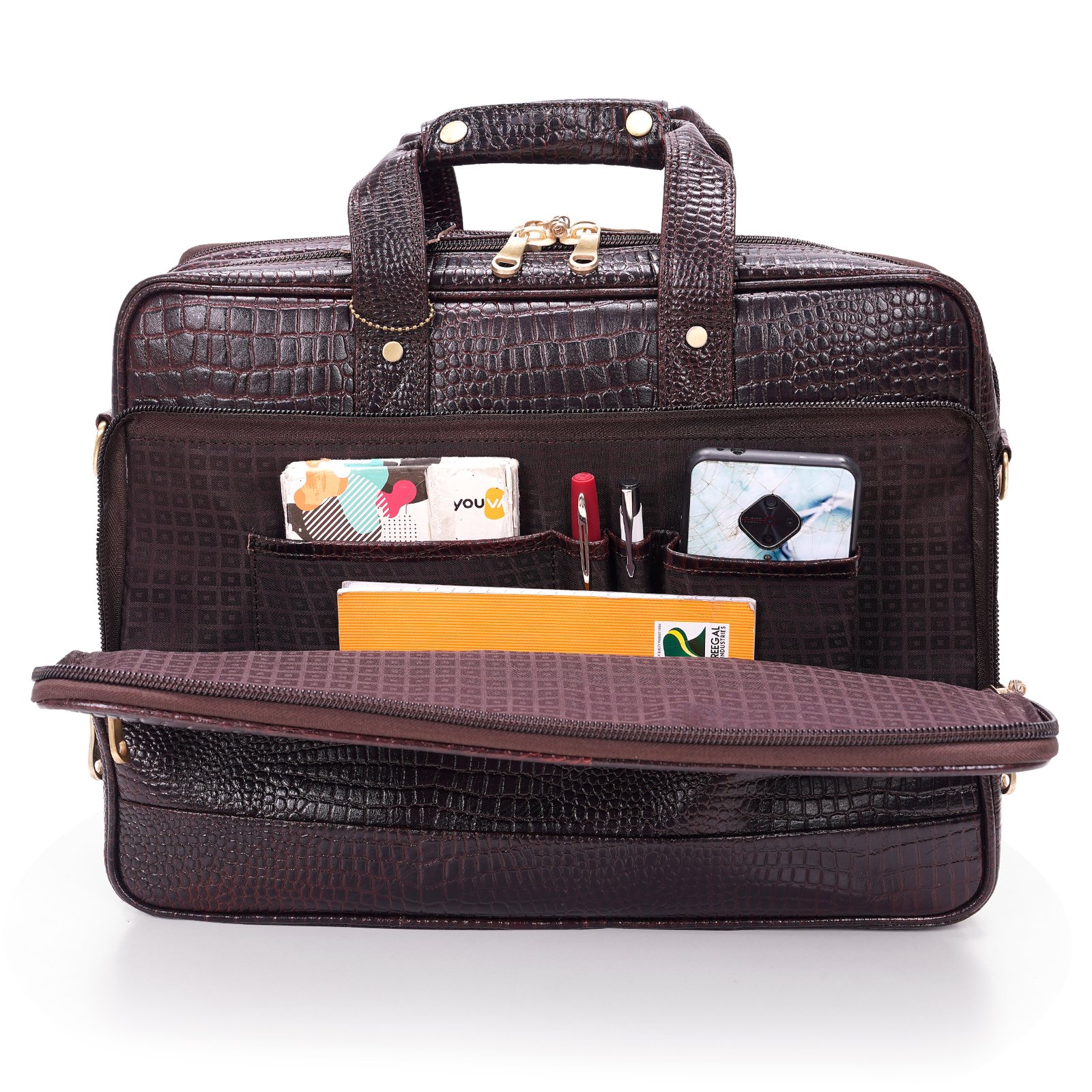 This slim leather bag is crafted from premium crocodile-embossed leather in a rich burgundy tone, combining style with functionality. Featuring multiple zippered compartments, gold-tone hardware, and a detachable shoulder strap, it is perfect for professionals seeking a sleek and organized carry solution. Ideal for daily commutes, business meetings, or travel. Key Features: Made from genuine leather 1 main zip compartment with padded laptop section (fits up to 15″) 5 additional zippered pockets for accessories 1 mobile/card/pen slot for easy access Trolley holder strap for travel convenience Removable and adjustable long shoulder strap Dimensions: Height – 28 cm, Length – 40 cm, Width – 6.5 cm Perfect for business professionals, students, and frequent travelers, this slim leather laptop bag offers a stylish and functional solution for carrying your laptop, documents, and daily essentials—whether you’re heading to the office, campus, or catching a flight. Disclaimer: Product color may slightly vary due to photographic lighting or