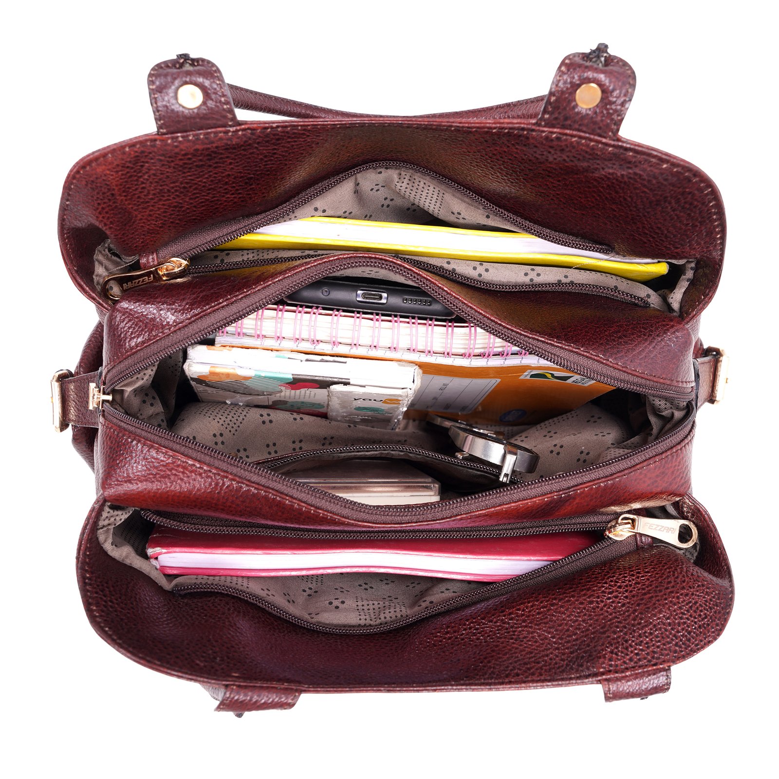 Red Cherry Leather Accessories- Genuine Leather Designed Sleek leather adds a professional finish to a medium-size briefcase that lets you organize devices, files and other important items in one section with dividers for easy are perfect for laptops while a slip pocket with a magnetic closure keeps magazines, articles and storage. Padded compartments business cards right where you need them.Made in natural grain leather. This leather laptop bag is handcrafted. With leather ,comfort linning and cousion the life of leather bag is extended with elegant and prime look. We surely assure you this leather bag will give you best comfort and look to carry. Its a stand along leather bag in your wardrobe collection and places you carry. Crafted from Genuine Leather. One main compartment with top zip-around and flap magnetic closure. Interior fully linned padded laptop compartment with organizer section for file,magazine,tablet etc.