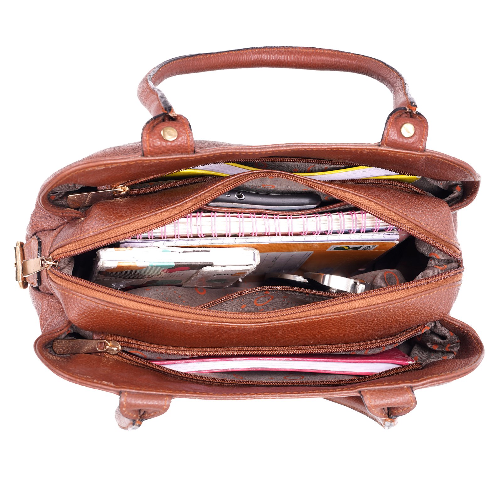 Brown solid handheld bag, has a zip closure Three main compartments out of which one has a zip separator sleeve, one external pocket and one inner pocket Two Handles Warranty: 6 months Warranty provided by Brand Owner / Manufacturer Size & Fit Height: 21 cm Width: 24.5 cm Depth: 13 cm Material & Care Synthetic leather Wipe with a clean, dry cloth when needed