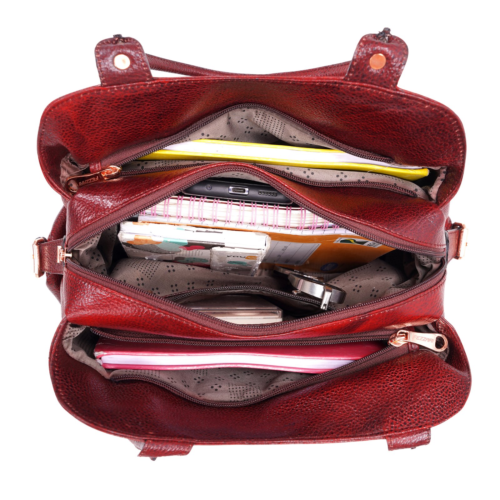 Red handbag Two short handles, has one long, adjustable and detachable sling strap Three main zip compartments, has a zip pocket in one and two slip pockets in another Size & Fit Height: 24 cm Width: 31 cm Depth: 16 cm Material & Care Synthetic leather Wipe with a clean dry cloth when needed